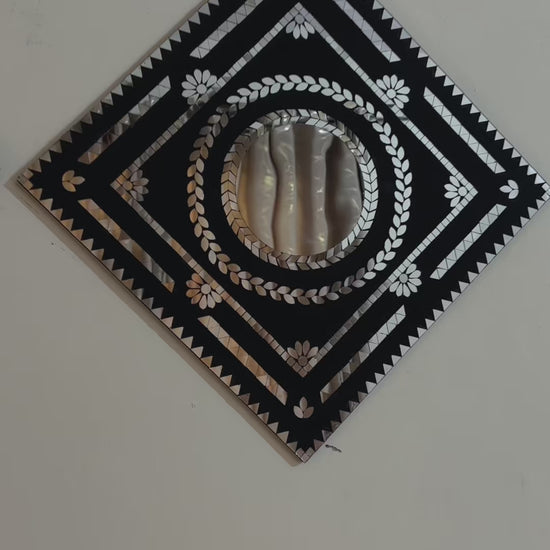 Each geometric layer of this art piece is embedded with hand-cut mirrors, forming a radiant symmetry that draws the eye to its reflective centerpiece.