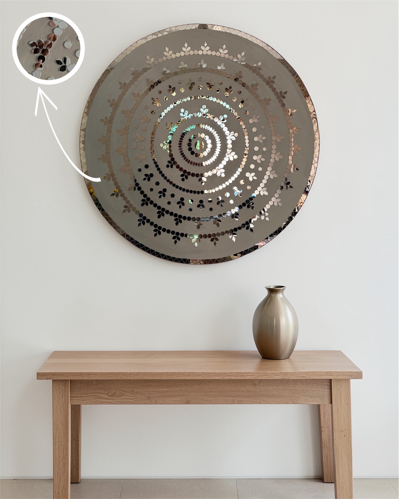 It’s a decorative mosaic mirror, real mirror glass is used to reflect light and add dimension, but it's primarily crafted as wall art, not a full reflective mirror.