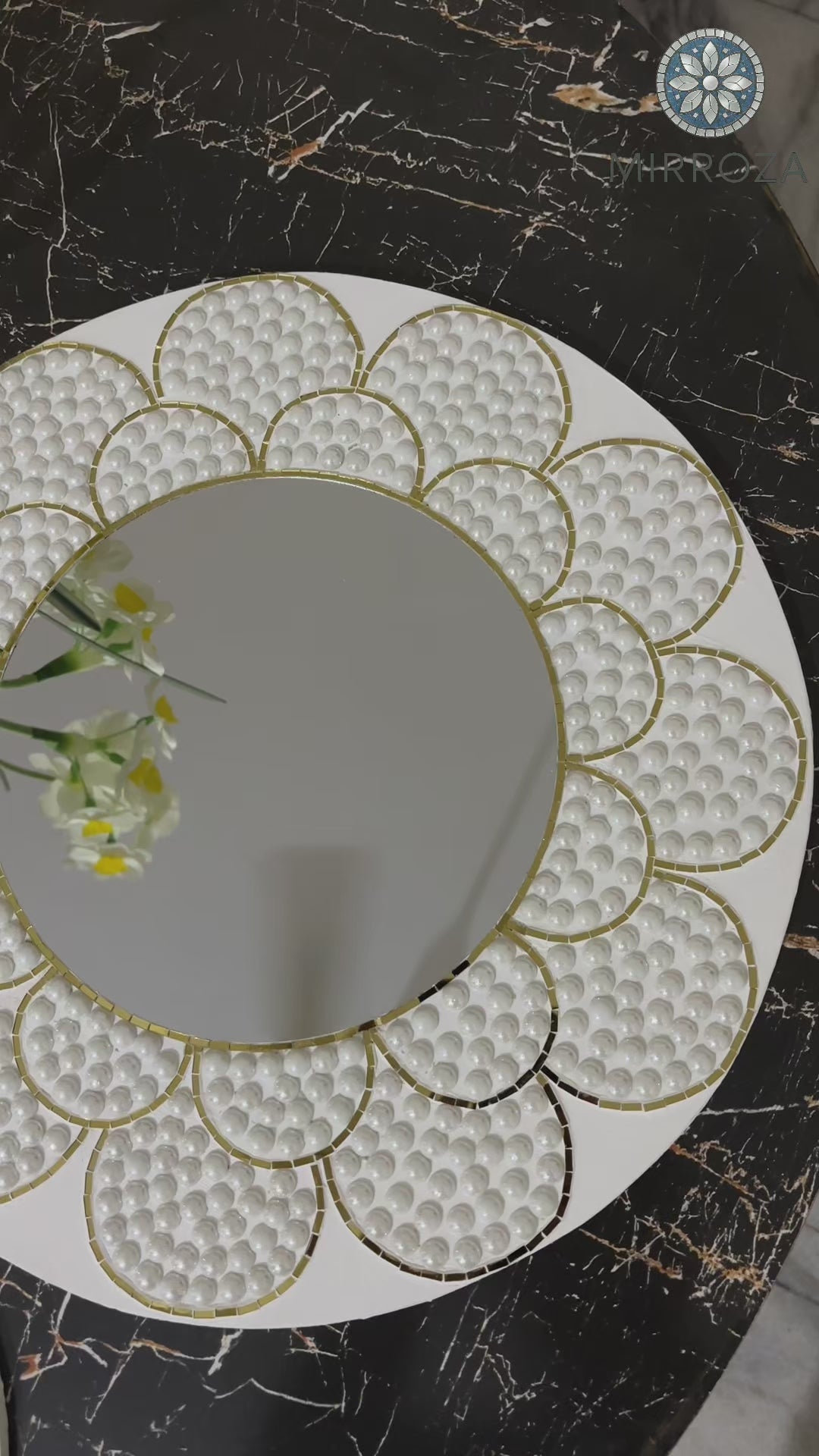 - Handcrafted mosaic with white stones & gold highlights